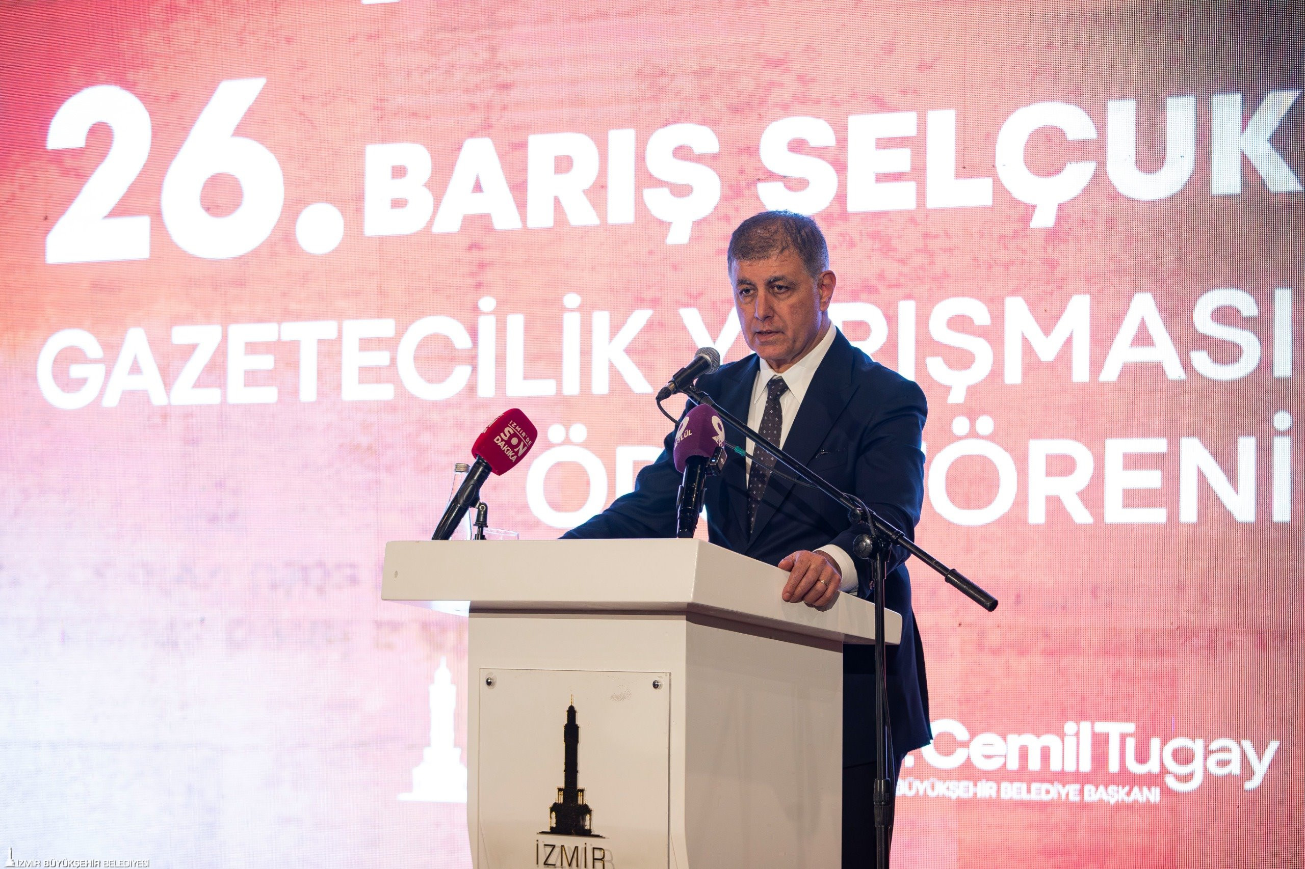 Uğur Mumcu, Ahmet Taner Kışlalı, Metin Göktepe, Abdi İpekçi gibi katledilen gazetecileri anan Başkan Tugay, “Yazmak cesaret ister ama gazeteci olmak yürek ister. Bir gün, bu ülkede sabahlar gazetecilerin gözaltı haberleriyle değil, gerçeklerin manşet olmasıyla başlayacak. Bir gün, gazeteciler haber yazarken başımıza ne gelir diye düşünmeyecek. Bir gün, mahkeme salonlarında haber savunulmayacak, yalan yargılanacak. Bir gün, genç gazeteciler mesleğe korkuyla değil, umutla başlayacak. İşsiz kalma endişesiyle değil, iyi haber yapma heyecanıyla. Çünkü o gün basın özgür olacak. Özgür bir basın varsa adalet nefes alır, demokrasi yaşar. Barış Selçuk ve Hande Mumcu’nun adını yaşatan bu ödül, yalnızca bir anma değildir. Sorumluluklarımızı hatırlama günüdür. Ya basın özgür olacak ya da demokrasi eksik kalacak” ifadelerini kullandı.