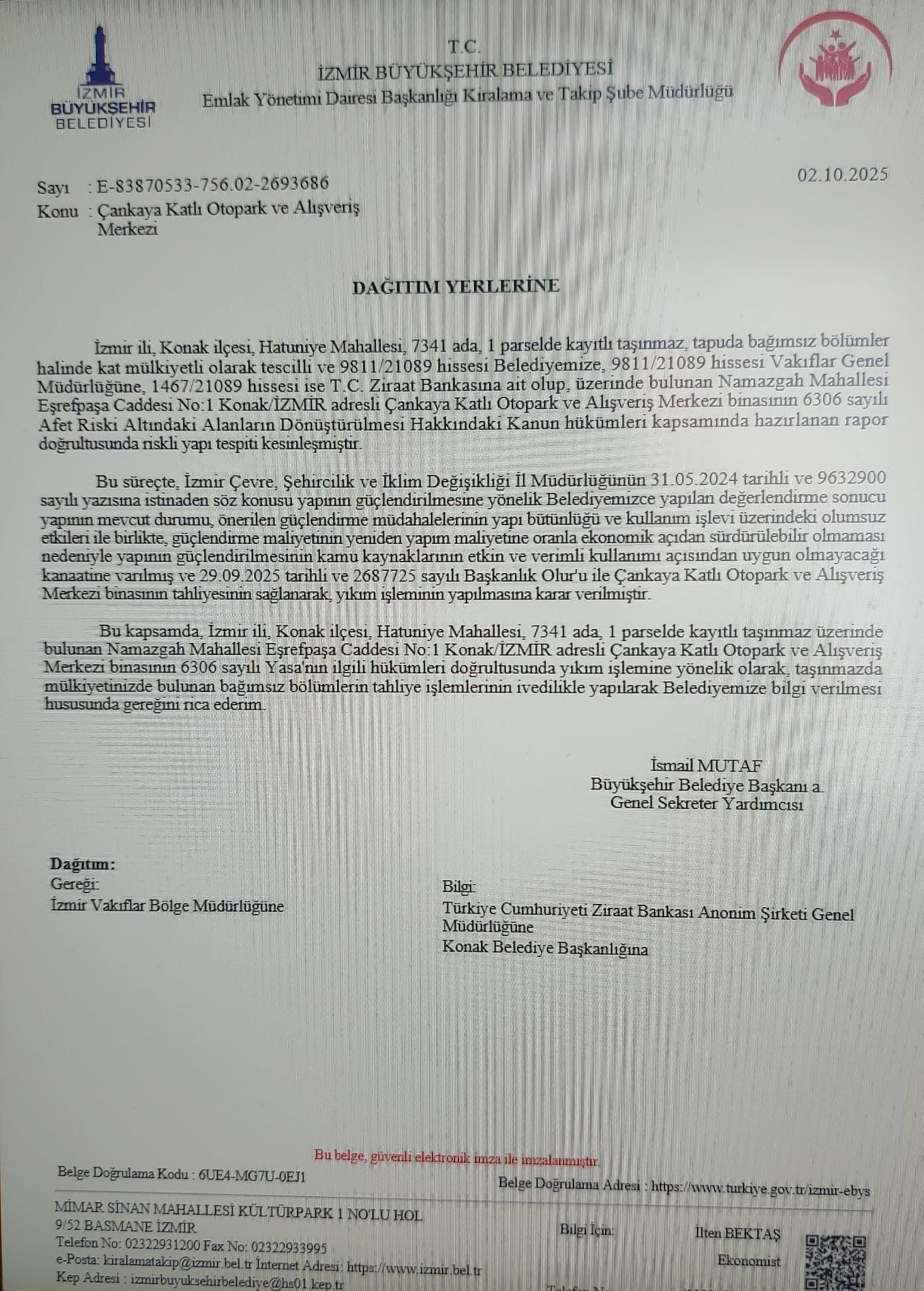 “İzmir Büyükşehir Belediye Başkanı Cemil Tugay’ın sorularımıza ivedilikle yanıt vererek şeffaflık ilkesine uygun davranacağına inanıyoruz. Aksi takdirde bu yıkım, Mezarlıkbaşı ve çevresinde AVM’nin 87 esnafını ve günde 3 bin 500 aracı ağırlayan Kemeraltı’ndaki 12 bin esnaf için ekonomik bir enkaz anlamına gelecektir.”