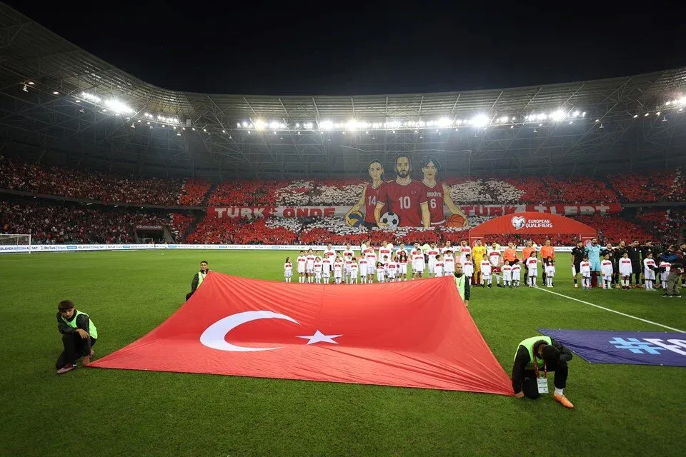 Kocaeli Stadı’nda taraftarlar, kırmızı-beyaz renklerle hazırlanan dev koreografi ile maça büyük destek verdi. Tribünlerde Türkiye haritası ve milli sporcuların görselleri yer aldı. Pankartlarda “Türk önde Türk ileri” mesajı dikkat çekti.
