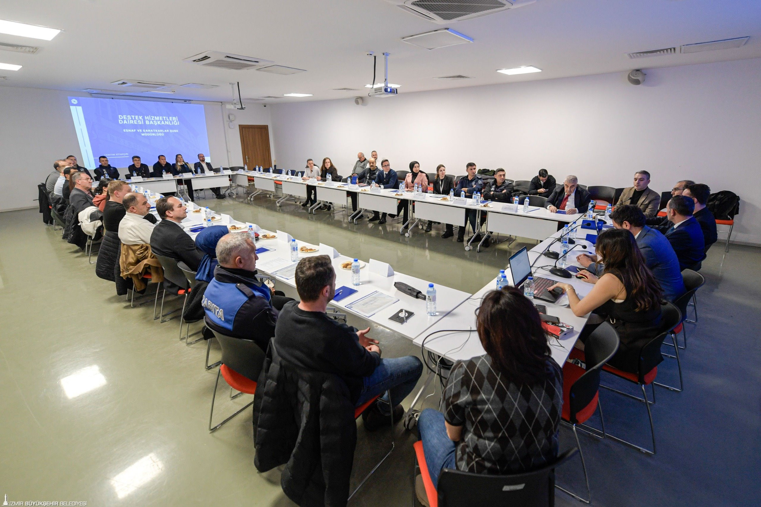 İzmir Büyükşehir Belediyesi Destek Hizmetler Dairesi Başkanlığı Esnaf ve Sanatkârlar Şube Müdürlüğü koordinasyonunda düzenlenen ve ilçe belediyelerinin katılımıyla gerçekleştirilen toplantıda, kurulun yol haritası ele alındı. Toplantıya, İzmir Büyükşehir Belediyesi Destek Hizmetleri Dairesi Başkanı Kazım Kaya, İzmir Esnaf ve Sanatkârlar Odaları Birliği Başkan Vekili Ali Üstün, Esnaf ve Sanatkârlar Şube Müdürü Mert Aslan ile ilgili bürokratlar katıldı.