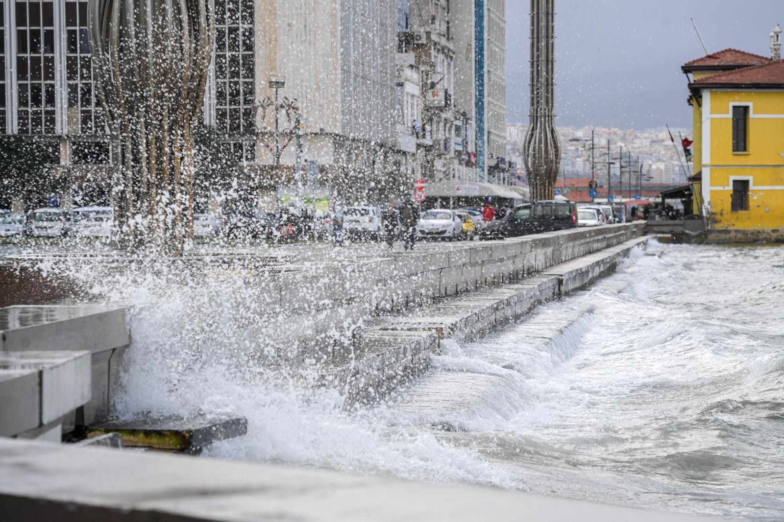İzmir Büyükşehir Belediyesi tarafından Kordon’da inşa edilen geçici fırtına duvarı, sabah saatlerinde etkili olan sağanak yağış ve fırtına nedeniyle oluşabilecek deniz taşkınlarını engelledi. Fen İşleri Dairesi Başkanlığı ekipleri, hava koşullarının olumsuzlaşmasıyla birlikte fırtına duvarının kapılarını aktif hale getirerek, olası risklere karşı önlem aldı.