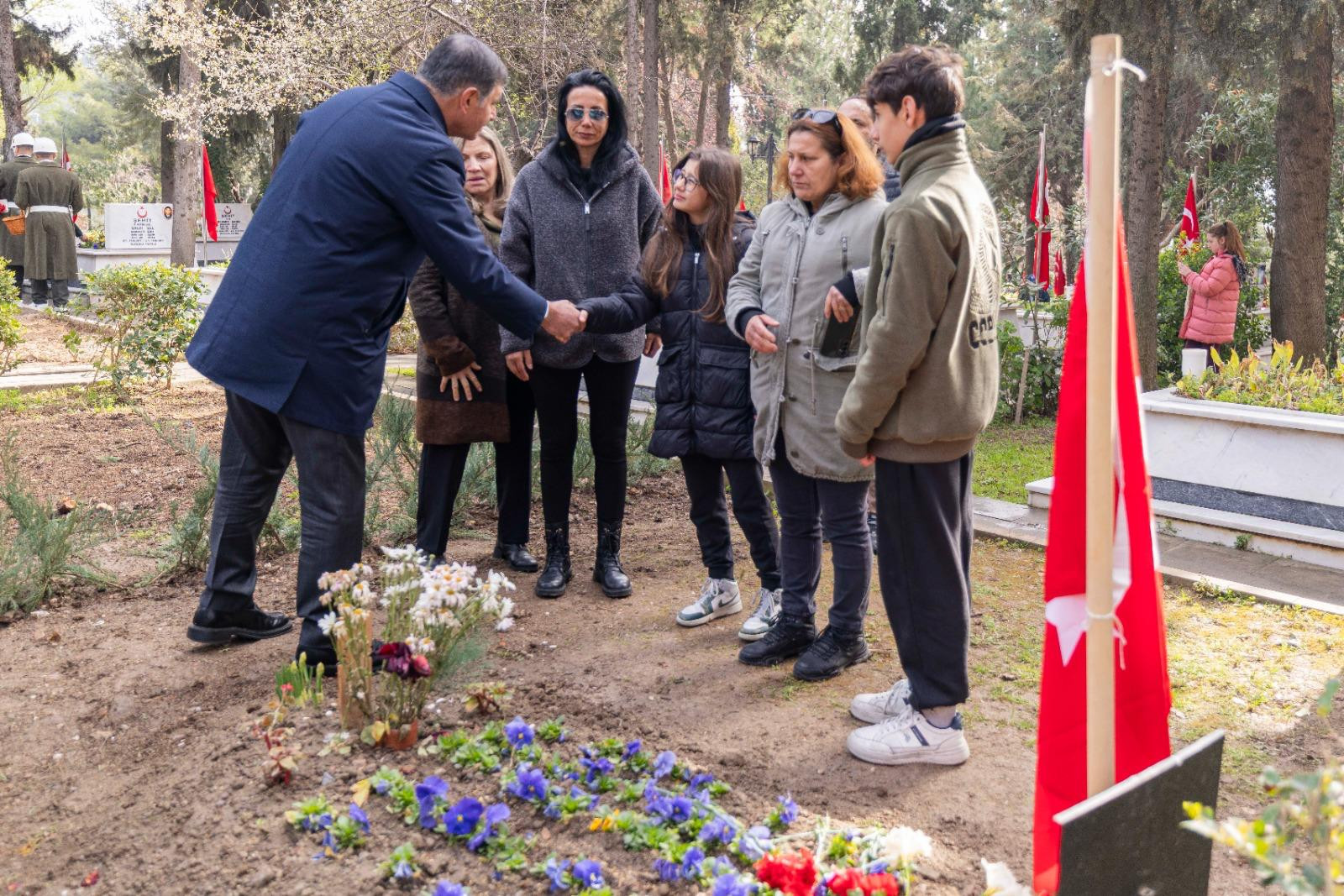 İzmir Büyükşehir Belediye Başkanı Cemil Tugay da şehit kabirlerine karanfil bırakarak dua etti, şehit yakınları ve gazilerle sohbet etti.
